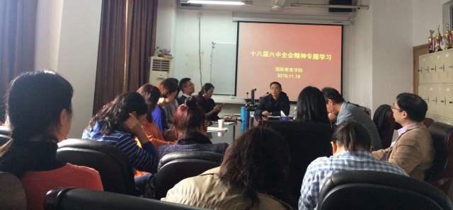 11月18日下午,国际教育学院召开专题组织生活会,党总支组织全体教工党员进行十八届六中全会精神专题学习,党总支书记何洪武老师向全体党员传达十八届六中全会的主要精神,并动员大家结合正在进行的“两学一做”学习教育活动,开展交流讨论。